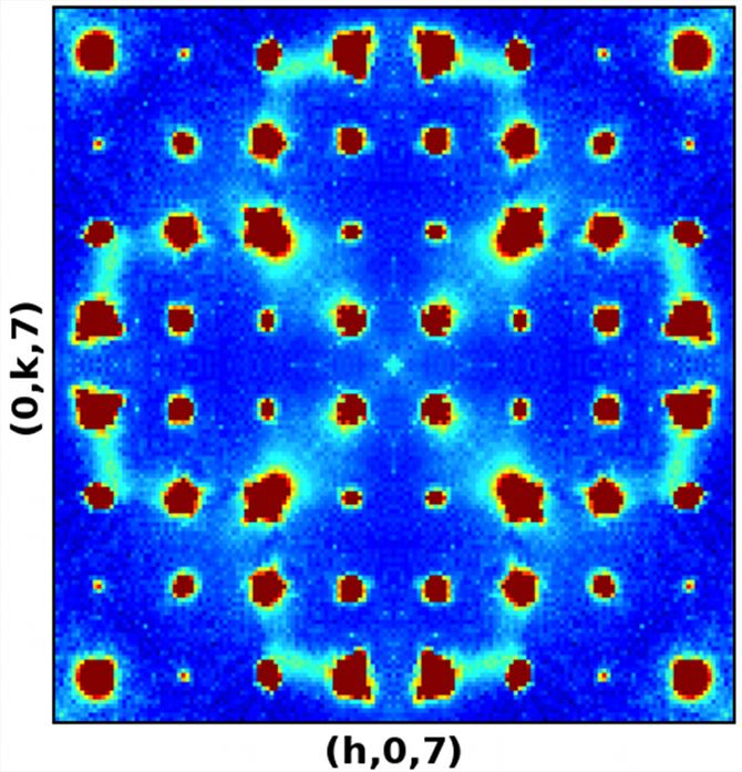 中子与电子没有相互作用,但是中子与原子核有很强的核作用力,利用这一点可以观测原子核的相对位置。图中展示的是中子衍射实验观测晶体中原子核的相对位置。(不同的大小代表着不同的原子,我猜)