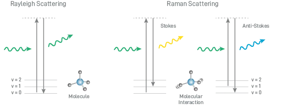 拉曼散射&瑞利散射的经典理论解释:光子的电矢量场和分子相互作用,分子产生感生电偶极矩。感生电偶极矩有三种频率变化,$\nu_0, \nu_0+2\nu_r, \nu_0-2\nu_r$, $\nu_r$为分子的转动频率。